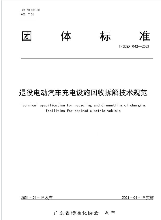 2021年4月19日,廣東省標(biāo)準(zhǔn)化協(xié)會發(fā)布團體標(biāo)準(zhǔn)《退役電動汽車充電設(shè)施回收拆解技術(shù)規(guī)范》,為日漸增多的電動汽車充電設(shè)施的回收拆解提供技術(shù)支撐。