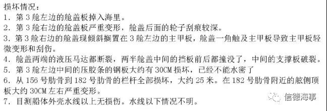 事故導(dǎo)致了百萬(wàn)美金的巨大損失;幸運(yùn)的是,事故發(fā)生時(shí)沒有任何人員站立在該艙左側(cè)甲板上;可以想象的是:如果當(dāng)時(shí)有人站立在左側(cè),則很難幸免!