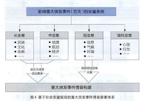 重大突發(fā)事件本身是一個復(fù)雜系統(tǒng)。當(dāng)嘗試通過“情景構(gòu)建”來表征重大突發(fā)事件的規(guī)律特點時,按照社會物理學(xué)理論,需要對一系列社會變量進(jìn)行描述,決定重大突發(fā)事件情景的變量包含:長變量(與民族、文化、宗教相關(guān)的變量)、中變量(與地理、規(guī)劃、經(jīng)濟(jì)、社會相關(guān)的變量)、短變量(與信息、氣候、環(huán)境、交通等相關(guān)的變量)、隨機(jī)變量(與心理、行為以及未知因素相關(guān)的變量)(見圖4)。為確保重大突發(fā)事件情景能夠準(zhǔn)確地代表不斷演化的國家風(fēng)險(或者地區(qū)風(fēng)險),情景構(gòu)建過程中,需將上面所述的長變量與中變量設(shè)置為情景恒定要素,當(dāng)這兩類變量發(fā)生變動時,需要及時修訂情景;此外,關(guān)于短變量,應(yīng)該基于“底線思維”,設(shè)置可能導(dǎo)致事件往最壞方向發(fā)展的變量,這樣可以有效保證與情景所匹配的目標(biāo)能力具備“冗余”。而隨機(jī)變量,對于情景構(gòu)建來說不具備較大價值,不應(yīng)該在情景中描述。