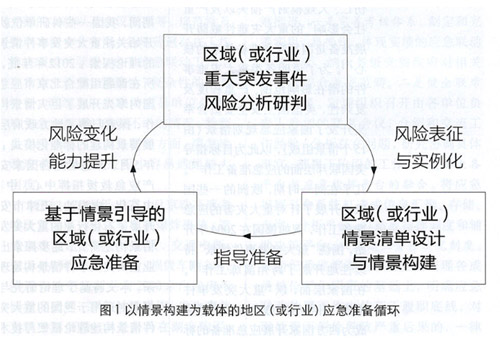 情景構(gòu)建是一個地區(qū)(或行業(yè))的戰(zhàn)略風(fēng)險管理工具,在地區(qū)(或行業(yè))的重大突發(fā)事件風(fēng)險研判基礎(chǔ)上,可以確定地區(qū)(或行業(yè))情景清單并且對每項典型風(fēng)險開展情景構(gòu)建,對典型風(fēng)險進(jìn)行實例化表征;在情景構(gòu)建結(jié)束后,一系列情景可以引導(dǎo)地區(qū)(或行業(yè))有的放矢開展應(yīng)急準(zhǔn)備行動,指導(dǎo)應(yīng)急能力的提升;伴隨著風(fēng)險環(huán)境的變化、應(yīng)急能力的提高,在風(fēng)險研判基礎(chǔ)上,可以將情景清單進(jìn)行動態(tài)調(diào)整、或者對某項(不符合當(dāng)下風(fēng)險的)情景進(jìn)行修訂。如此,可以形成一個以“情景構(gòu)建”為載體的應(yīng)急準(zhǔn)備循環(huán),如圖1所示。
