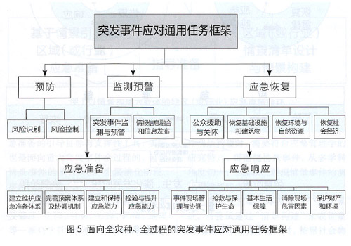 筆者所在課題組參考美國UTL的格式,對我國多災(zāi)種的應(yīng)對任務(wù)進(jìn)行了分析,提出了符合我國體制機(jī)制特點的突發(fā)事件應(yīng)對通用任務(wù)框架,該框架包含5類任務(wù)領(lǐng)域、17類一級任務(wù)、64類二級任務(wù)(如圖5所示)。該任務(wù)框架是面向全災(zāi)種、全過程的任務(wù)框架,無論哪種類型的突發(fā)事件情景,均可在該框架的引導(dǎo)下開展任務(wù)梳理。
