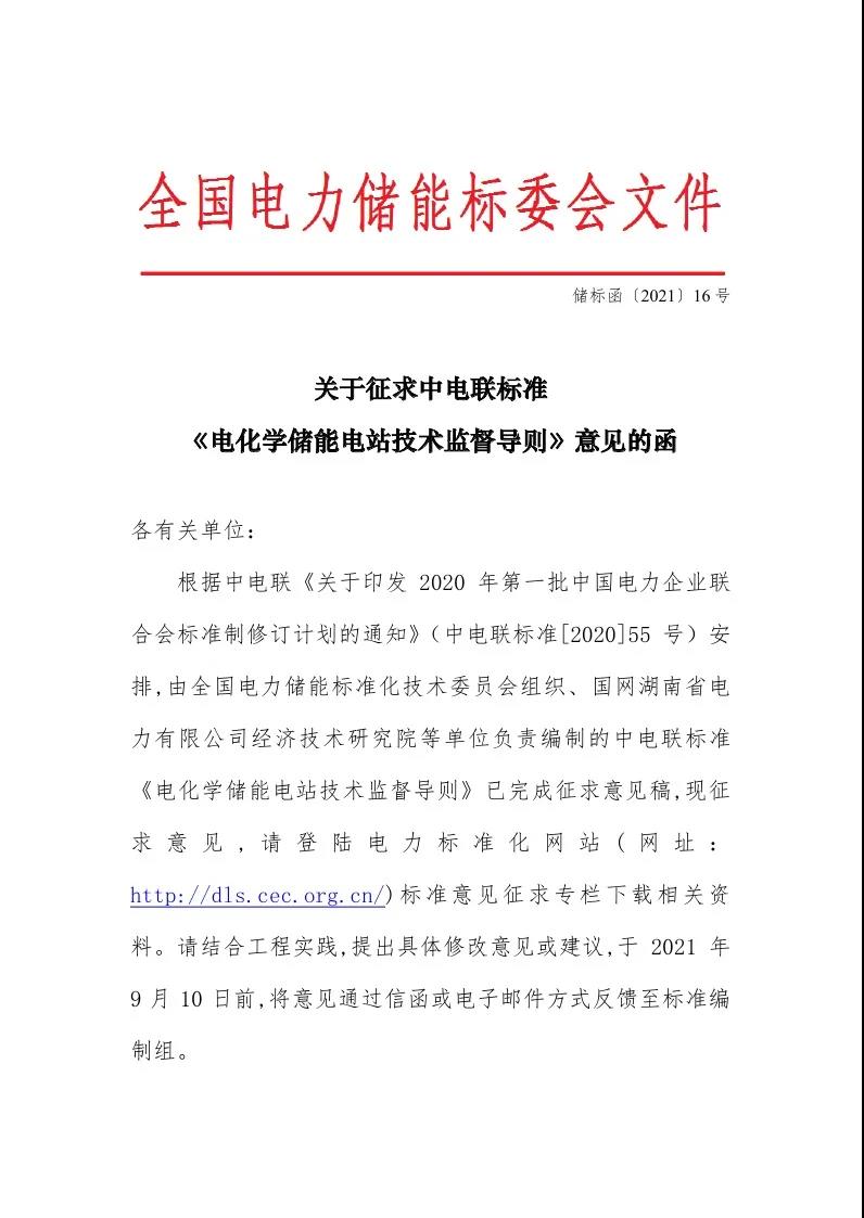 征求意見:關(guān)于征求中電聯(lián)標(biāo)準(zhǔn)《電化學(xué)儲(chǔ)能電站技術(shù)監(jiān)督導(dǎo)則》意見的函