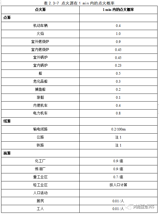 根據(jù)《危險化學品生產(chǎn)裝置和儲存設施外部安全防護距離確定方法》(GB/T 37243-2019),典型點火源分為:根據(jù)化工園區(qū)情況,點火源主要為人員靜電、違章動火、電氣設施、雷擊、機動車輛、使用工具(鐵質(zhì))不當產(chǎn)生火花以及外來火源等。根據(jù)《化工企業(yè)定量風險評價導則》(AQ/T 3046-2013)附錄G,立即點火概率與裝置類型、物質(zhì)種類及泄漏(釋放)有關,固定裝置可燃物質(zhì)泄漏后,立即點火概率見下表。延遲點火的點火概率應考慮點火源特性、泄漏組分以及點火源處于蒸氣云團內(nèi)的概率,不同點火源在1min內(nèi)的點火概率見下表。