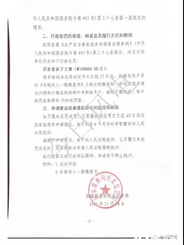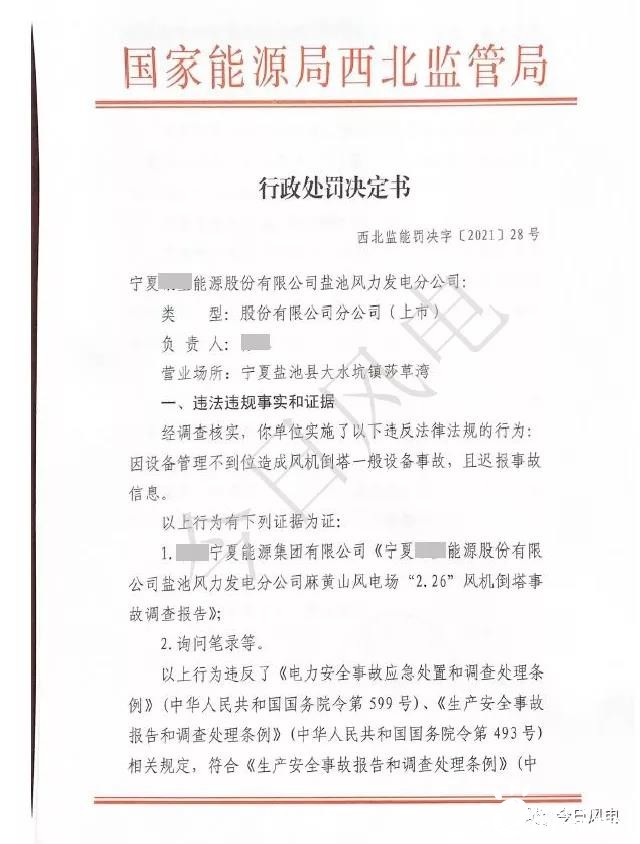 近日,國家能源局西北監(jiān)管局發(fā)布【2021】28號行政處罰決定書,根據(jù)該處罰決定,因設(shè)備管理不到位造成風(fēng)機(jī)倒塔一般設(shè)備事故,且遲報事故信息,根據(jù)《生產(chǎn)安全事故報告和調(diào)查處理條例》(中國人民共和國國務(wù)院令493號)第三十七條規(guī)定,對寧夏銀星能源股份有限公司鹽池風(fēng)力發(fā)電分公司罰款10萬元。