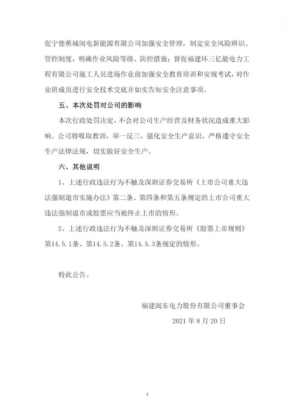 《公告》顯示,2021年6月19日,因上堡風(fēng)電場110kV#1主變發(fā)生跳閘事件,在跳閘事件現(xiàn)場調(diào)查和對閩東電力的后續(xù)檢查中,發(fā)現(xiàn)閩東電力、蕉城閩電、環(huán)三億能均存在違反相關(guān)法律條文的情況,分別處以10萬元、5萬元、5萬元的罰款。
