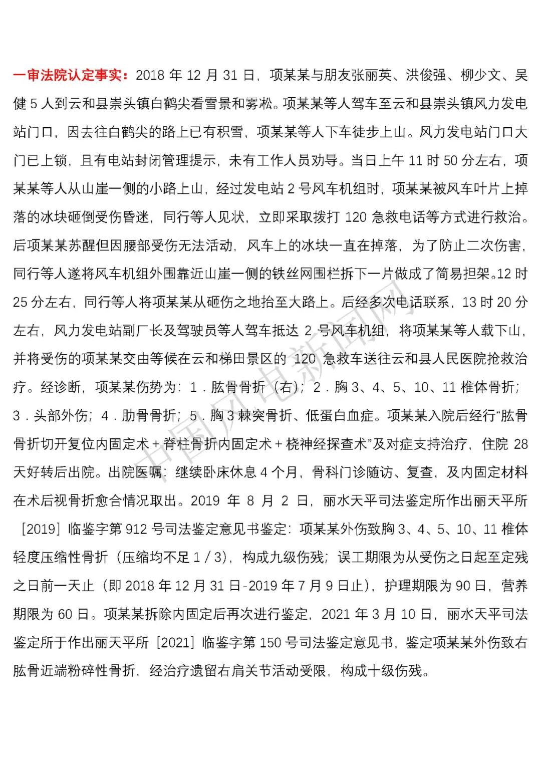 法院認(rèn)定事實(shí):2018年12月31日,項(xiàng)建英與朋友張麗英、洪俊強(qiáng)、柳少文、吳健5人到云和縣崇頭鎮(zhèn)白鶴尖看雪景和霧凇。項(xiàng)建英等人駕車至云和縣崇頭鎮(zhèn)風(fēng)力發(fā)電站門口,因去往白鶴尖的路上已有積雪,項(xiàng)建英等人下車徒步上山。風(fēng)力發(fā)電站門口大門已上鎖,且有電站封閉管理提示,未有工作人員勸導(dǎo)。當(dāng)日上午11時50分左右,項(xiàng)建英等人從山崖一側(cè)的小路上山,經(jīng)過發(fā)電站2號風(fēng)車機(jī)組時,項(xiàng)建英被風(fēng)車葉片上掉落的冰塊砸倒受傷昏迷,同行等人見狀,立即采取撥打120急救電話等方式進(jìn)行救治。后項(xiàng)建英蘇醒但因腰部受傷無法活動,風(fēng)車上的冰塊一直在掉落,為了防止二次傷害,同行等人遂將風(fēng)車機(jī)組外圍靠近山崖一側(cè)的鐵絲網(wǎng)圍欄拆下一片做成了簡易擔(dān)架。12時25分左右,同行等人將項(xiàng)建英從砸傷之地抬至大路上。后經(jīng)多次電話聯(lián)系,13時20分左右,風(fēng)力發(fā)電站副廠長及駕駛員等人駕車抵達(dá)2號風(fēng)車機(jī)組,將項(xiàng)建英等人載下山,并將受傷的項(xiàng)建英交由等候在云和梯田景區(qū)的120急救車送往云和縣人民醫(yī)院搶救治療。經(jīng)診斷,項(xiàng)建英傷勢為:1.肱骨骨折(右);2.胸3、4、5、10、11椎體骨折;3.頭部外傷;4.肋骨骨折;5.胸3棘突骨折、低蛋白血癥。項(xiàng)建英入院后經(jīng)行“肱骨骨折切開復(fù)位內(nèi)固定術(shù)+脊柱骨折內(nèi)固定術(shù)+橈神經(jīng)探查術(shù)”及對癥支持治療,住院28天好轉(zhuǎn)后出院。出院醫(yī)囑:繼續(xù)臥床休息4個月,骨科門診隨訪、復(fù)查,及內(nèi)固定材料在術(shù)后視骨折愈合情況取出。2019年8月2日,麗水天平司法鑒定所作出麗天平所[2019]臨鑒字第912號司法鑒定意見書鑒定:項(xiàng)建英外傷致胸3、4、5、10、11椎體輕度壓縮性骨折(壓縮均不足1/3),構(gòu)成九級傷殘;誤工期限為從受傷之日起至定殘之日前一天止(即2018年12月31日-2019年7月9日止),護(hù)理期限為90日,營養(yǎng)期限為60日。項(xiàng)建英拆除內(nèi)固定后再次進(jìn)行鑒定,2021年3月10日,麗水天平司法鑒定所于作出麗天平所[2021]臨鑒字第150號司法鑒定意見書,鑒定項(xiàng)建英外傷致右肱骨近端粉碎性骨折,經(jīng)治療遺留右肩關(guān)節(jié)活動受限,構(gòu)成十級傷殘。