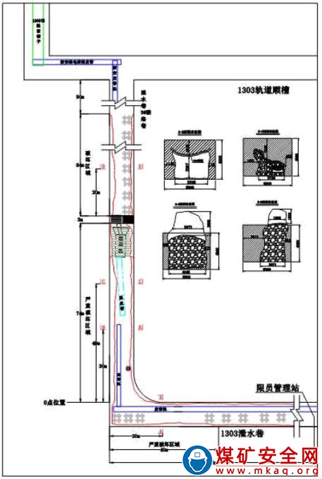 1303 工作面泄水巷與 3 號聯(lián)絡(luò)巷拐點(diǎn)以外 100 米巷道,拐點(diǎn)向上 74 米巷道,共 174 米巷道出現(xiàn)不同程度破壞,其中嚴(yán)重段為拐點(diǎn)以外 40 米巷道及拐點(diǎn)向上 74 米巷道,共計 114 米;3 號聯(lián)絡(luò)巷貫通點(diǎn)向上 174 米巷道出現(xiàn)不同程度破壞,其中嚴(yán)重段為貫通點(diǎn)以上 84 米巷道。破壞巷道共計 348 米,其中嚴(yán)重破壞段為198 米。巷道破壞位置見圖 4,具體情況如下: