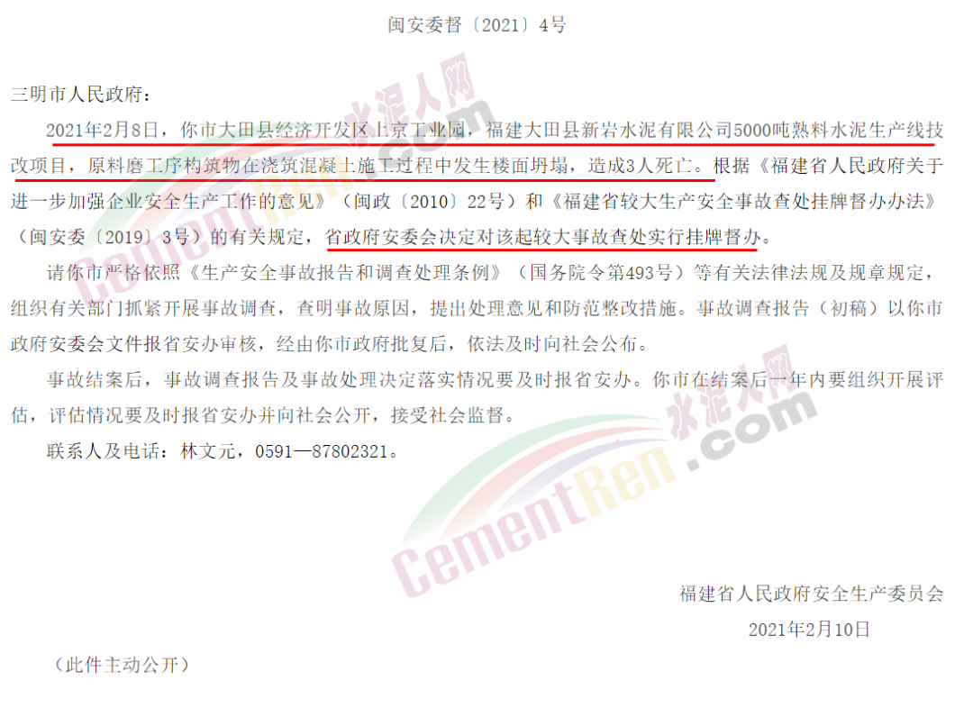 據(jù)水泥人網(wǎng)了解,福建省應(yīng)急管理廳發(fā)布較大生產(chǎn)安全事故查處掛牌督辦通知書(三明大田2.8水泥技改項目施工過程樓面坍塌事故)稱,2021年2月8日,三明市大田縣經(jīng)濟(jì)開發(fā)區(qū)上京工業(yè)園,福建大田縣新巖水泥有限公司5000噸熟料水泥生產(chǎn)線技改項目,原料磨工序構(gòu)筑物在澆筑混凝土施工過程中發(fā)生樓面坍塌,造成3人死亡。 依據(jù)有關(guān)規(guī)定,福建省政府安委會決定對該起較大事故查處實(shí)行掛牌督辦。
