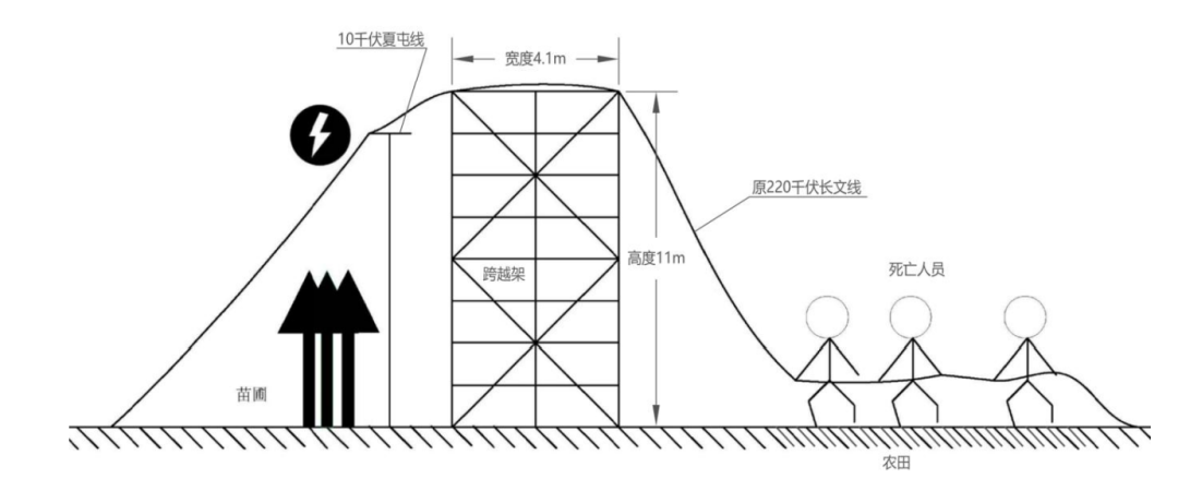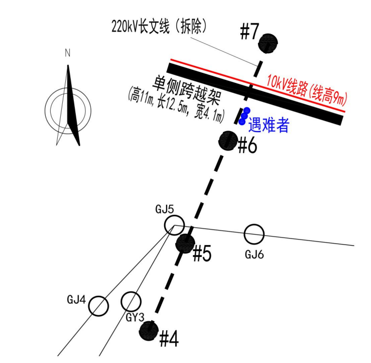 2023 年5月8日,施工項目部安排施工人員在原 220 千伏長文線 6-7 號桿塔間進行10千伏夏屯線跨越架搭設(shè),因民事阻工僅在事故發(fā)生處南側(cè)搭設(shè)了單側(cè)跨越架。