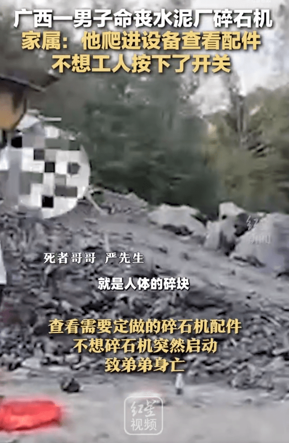 6月12日,廣西北流的嚴(yán)先生爆料稱,5月25日,他的弟弟受邀前往一家水泥廠查看需要定做的碎石機(jī)配件,不想碎石機(jī)突然啟動,致弟弟身亡。