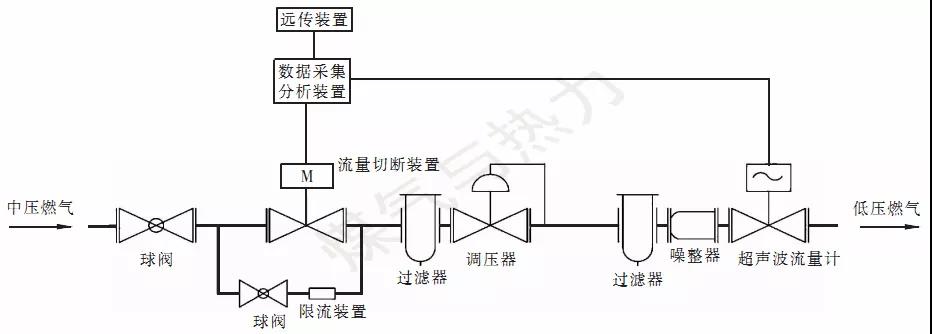 過濾器、噪整器及超聲波流量計安裝在調(diào)壓器后的低壓側(cè),流量切斷裝置安裝在調(diào)壓器和過濾器前,用于監(jiān)測管道瞬時流量變化。流量切斷裝置并聯(lián)一個球閥及限流裝置,當出現(xiàn)大流量泄漏需要切斷時,流量切斷裝置起快速切斷氣路的作用。有時調(diào)壓箱下游用戶較多,一旦完全停氣,復氣十分困難,在搶修作業(yè)允許管道微正壓操作時,遇到泄漏可以通過限流的方式處置,打開旁路球閥,通過限流裝置將瞬時流量限制在安全的范圍內(nèi)。庭院燃氣管道泄漏報警切斷(限流)裝置,除了數(shù)據(jù)采集分析裝置和遠傳裝置安裝在調(diào)壓箱外,其余均安裝在調(diào)壓箱內(nèi)。數(shù)據(jù)采集分析裝置通過線纜連接超聲波流量計與流量切斷裝置,實時采集超聲波流量計的流量信息,對管道流量進行監(jiān)控,當出現(xiàn)異常流量時,通過遠傳裝置將報警信息發(fā)送到燃氣公司的監(jiān)測平臺系統(tǒng)。在接到監(jiān)測平臺系統(tǒng)關(guān)閥指令,或數(shù)據(jù)采集分析裝置判斷出異常流量超過限定值時,數(shù)據(jù)采集分析裝置發(fā)送關(guān)閥指令,通過流量切斷裝置切斷氣路。
