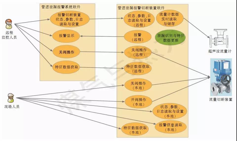 對庭院燃氣管道泄漏報警切斷(限流)裝置的方案設計與實現(xiàn)進行探討,包括裝置組成、泄漏識別基本原理、裝置主要功能與設計選型(數(shù)據(jù)采集分析裝置、超聲波流量計、遠傳裝置)、軟件系統(tǒng)用例說明與程序邏輯架構(gòu)。在白天及傍晚用氣時段,通過實時監(jiān)測瞬時流量變化,識別突發(fā)較大的泄漏事故;在夜間用氣低谷時段,通過測算流量累積量,識別小的泄漏。識別泄漏后,通過遠傳裝置將報警信息發(fā)送到燃氣公司的監(jiān)測平臺系統(tǒng)。在接到監(jiān)測平臺系統(tǒng)關(guān)閥指令,或數(shù)據(jù)采集分析裝置判斷出異常流量超過限定值時,數(shù)據(jù)采集分析裝置發(fā)送關(guān)閥指令,通過流量切斷裝置切斷氣路。