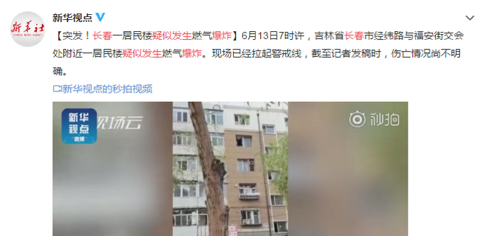 6月13日7時許,吉林省長春市經(jīng)緯路與福安街交會處附近一居民樓疑似發(fā)生燃?xì)獗ā?/span>