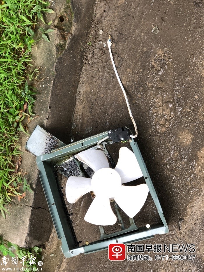 ▲爐灶因燃爆飛出窗戶,掛在窗臺上。 南國早報記者 鄒財麟攝