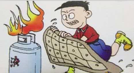 ●   遇到煤氣泄漏或輸出管著火時,應采取正確的滅火方法,可以用濕毛巾捂住口鼻進入室內,并用浸濕的棉被蓋住燃燒處后關閉閥門。