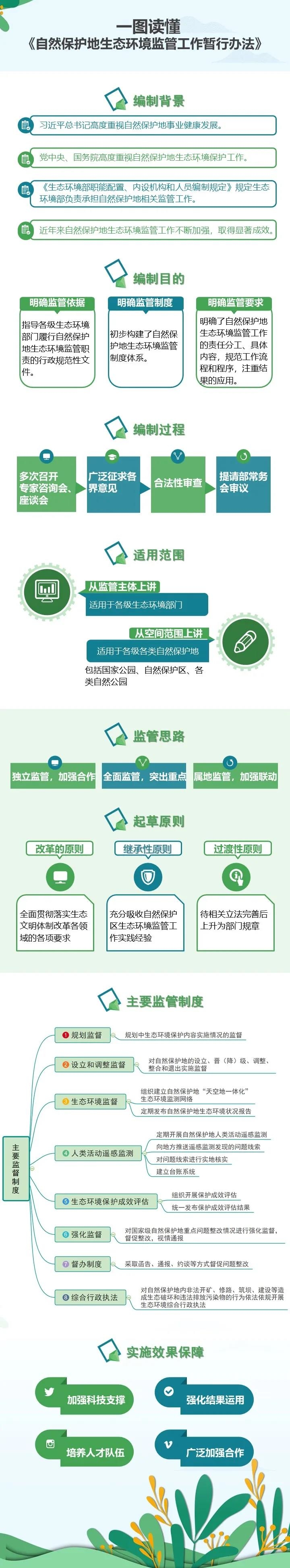 在這樣的背景下,生態(tài)環(huán)境部組織編制了《暫行辦法》,是深入貫徹習近平生態(tài)文明思想,有效落實黨中央國務院關于自然保護地事業(yè)改革各項重大部署,切實履行自然保護地生態(tài)環(huán)境監(jiān)管職責的重要舉措。其主要目的,一是明確監(jiān)管依據(jù) ,《暫行辦法》是指導各級生態(tài)環(huán)境部門履行自然保護地生態(tài)環(huán)境監(jiān)管職責的行政規(guī)范性文件;二是明確監(jiān)管制度,《暫行辦法》初步構建了自然保護地生態(tài)環(huán)境監(jiān)管制度體系;三是明確監(jiān)管要求, 《暫行辦法》明確了自然保護地生態(tài)環(huán)境監(jiān)管工作的責任分工、具體內容,規(guī)范工作流程和程序,注重結果的應用。